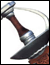 Sword - His sword is hitched onto his back by a hilt. His sword has a round hand guard and a wooden grip. |
